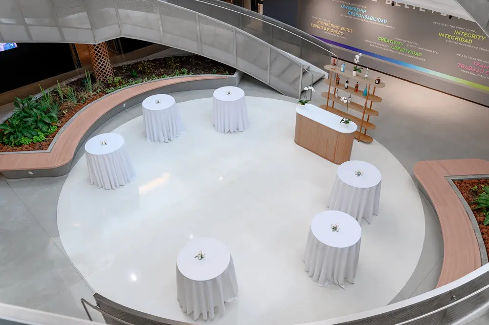 This intimate spherical space serves as the core of Telemundo Center, providing visibility and connectivity across all three floors. Adorned with live greenery and equipped with power access at every corner, it’s a versatile and inviting area often used to complement meetings and events in the Training Lab and Courtyard. Its unique design makes it perfect for hosting a variety of events, from small gatherings to larger activations.